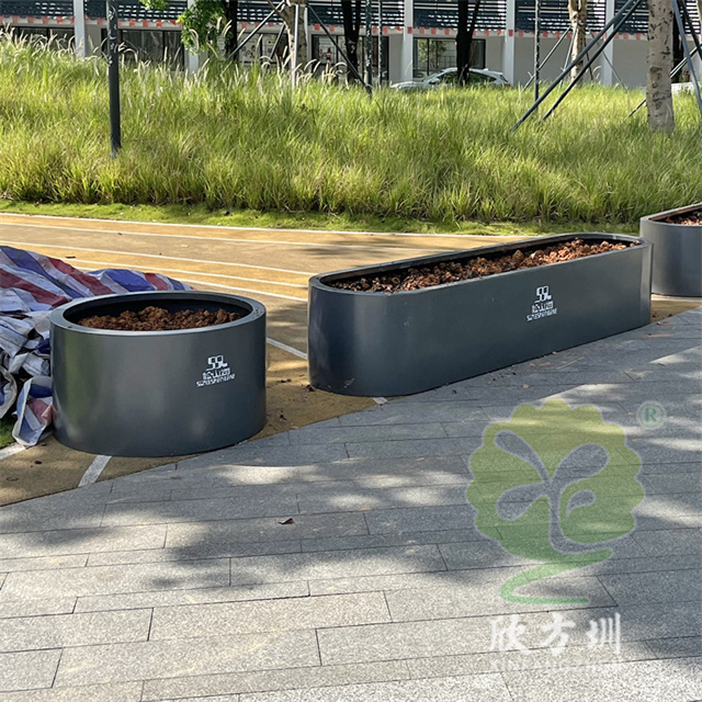 东莞松山湖公园镀锌板花盆花箱采用了3.0mm的镀锌铁板制作而成,一款椭圆形一款圆柱形设计,金属表面喷塑喷粉灰色,金属花盆具有独特的质感,常能为室内外环境增添一份高级感和时尚感,选用金属花盆能够大大降低成本,尺寸规格颜色可以定制。