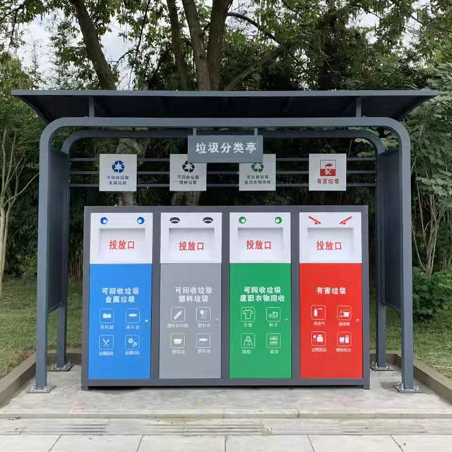 目前,户外烤漆大型垃圾分类站是城市生活垃圾处置的主流趋势,也是现代城市文明进步的标志之一,有利于提升垃圾清运效率,便于再生资源的回收利用,减少环境污染,缓解环卫工人常规保洁的压力。垃圾分类亭,分为地基基础设施、公益宣传栏、立柱、顶棚等,亭内设置可回收、有害垃圾、厨房垃圾和其他垃圾等垃圾桶,垃圾桶及宣传栏配有垃圾分类的宣传标语,广大群众可以根据垃圾桶的提示标语,将废弃的生活垃圾投放到对应的垃圾桶中。
