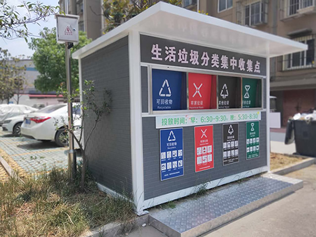 目前,户外生活垃圾分类集中收集房是城市生活垃圾处置的主流趋势,也是现代城市文明进步的标志之一,有利于提升垃圾清运效率,便于再生资源的回收利用,减少环境污染,缓解环卫工人常规保洁的压力。垃圾分类亭,分为地基基础设施、公益宣传栏、立柱、顶棚等,亭内设置可回收、有害垃圾、厨房垃圾和其他垃圾等垃圾桶,垃圾桶及宣传栏配有垃圾分类的宣传标语,广大群众可以根据垃圾桶的提示标语,将废弃的生活垃圾投放到对应的垃圾桶中。