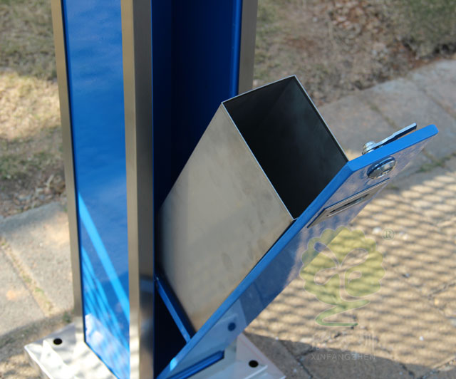 C635户外吸烟柱采用优质不锈钢剪切、组装、焊接、丝印而成,不锈钢具有很好的坚固耐用,防水防锈,时尚美观作用。它包括外套管、支座、内套管、烟灰盒、底座。外套管的底端固定连接在支座上,外套管的侧壁上设有烟蒂置入口,内套管用于集中收纳从外套管的烟蒂置入口投入的烟蒂,内套管设在外套管的内管腔中,内内套管的开口端朝上,烟蒂置入口与内套管的开口相连通,以使得从烟蒂置入口投入的烟蒂可从内套管的开口端落入到内套管的内管腔中;