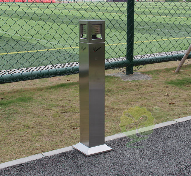 C280方形不锈钢灭烟柱采用优质不锈钢剪切、组装、焊接、丝印而成,它包括外套管、支座、内套管、烟灰盒、底座。外套管的底端固定连接在支座上,外套管的侧壁上设有烟蒂置入口,内套管用于集中收纳从外套管的烟蒂置入口投入的烟蒂,内套管设在外套管的内管腔中,内内套管的开口端朝上,烟蒂置入口与内套管的开口相连通,以使得从烟蒂置入口投入的烟蒂可从内套管的开口端落入到内套管的内管腔中;